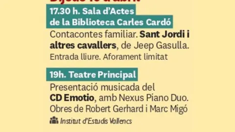 - La Bisbal del Penedès: Espectacle de contes "Sant Jordi, la princesa i el drac llaminer" a l’Auditori del Centre Municipal de Cultura a les 18 h. Públic infantil. També hi haurà la presentació de llibre: "Mossèn Bundó i l’ermita de Santa Cristina", a les 20 h, per a tots els públics, commemorant 150 anys de Mossèn Bundó.