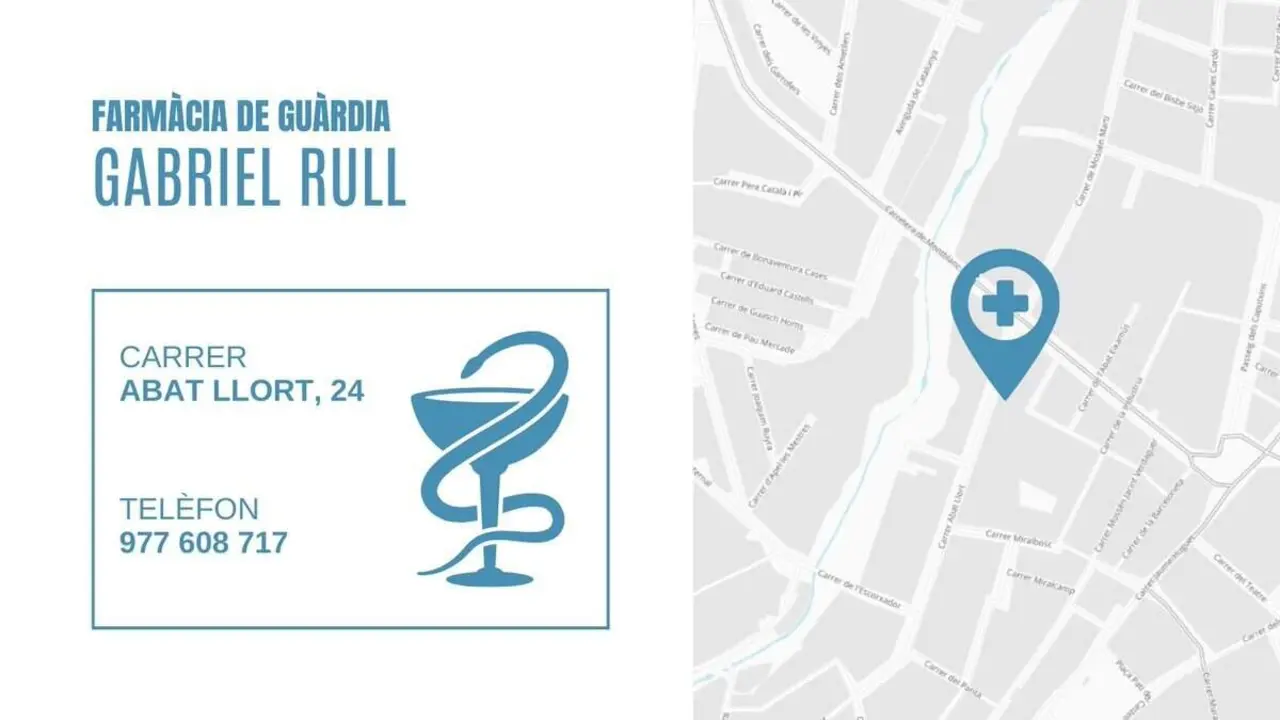 La farmàcia de guàrdia avui a Valls és Gabriel Rull Ferre al carrer Abat Llort